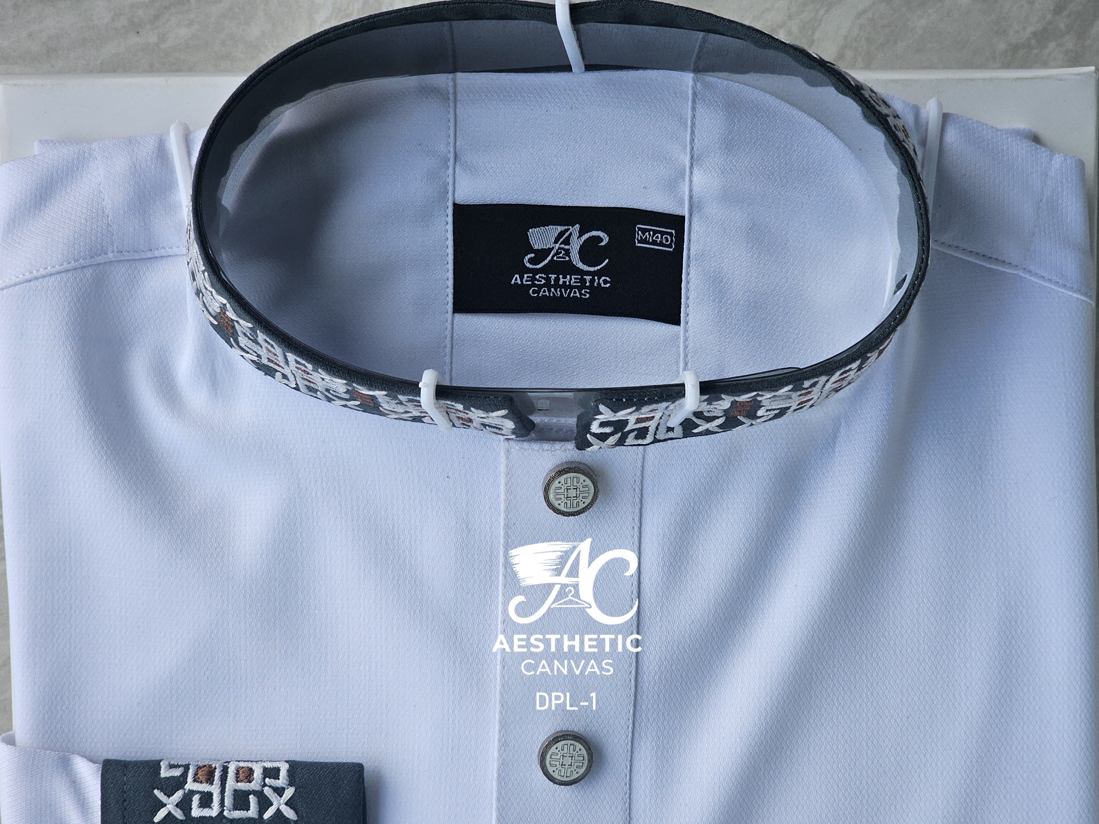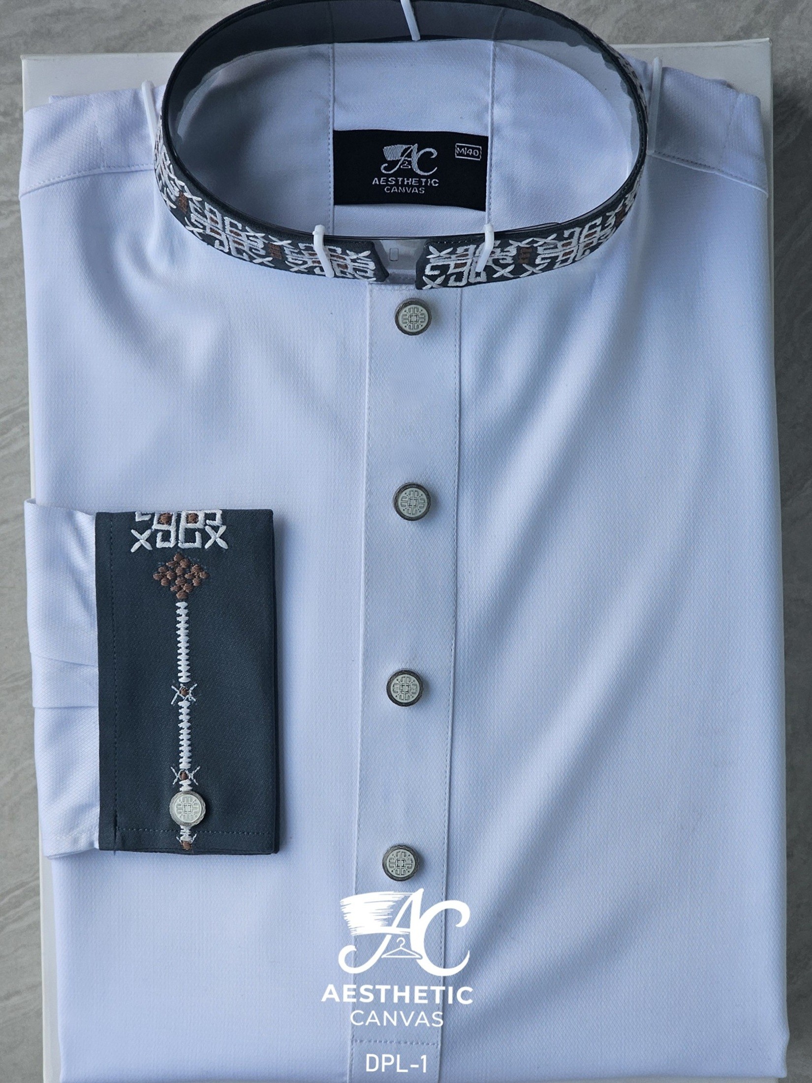 Cotton fabric with hand machine Embroidery Work on collars & sleeves (double cuff).